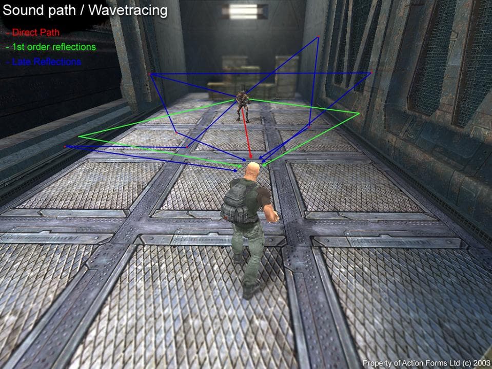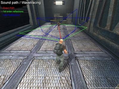 В любом случае, как бы вы не реализовывали эти эффекты (с помощью Aureal A3D, Creative Labs EAX или просто вручную на собственном звуковом движке) — все равно придется трассировать геометрию (всю или только звуковую) на предмет установления прямой видимости с источником звука. А это достаточно сильный удар по производительности. Вот и получается, что почти всегда (если говорить о шутерах, 3D РПГ или любых других подобных играх, пытающихся внести максимальный реализм в звуке) надо строить упрощенную геометрию для звука. К счастью, такая геометрия строиться (почти всегда) для подсчета collision для игрока — опять таки, чтобы не трассировать всю геометрию вокруг игрока в помещении. Поэтому, достаточно сделать эту же геометрию чуть более детально для звука. Конечно же, есть и другие способы, но оставим их на совести программистов игровых движков.