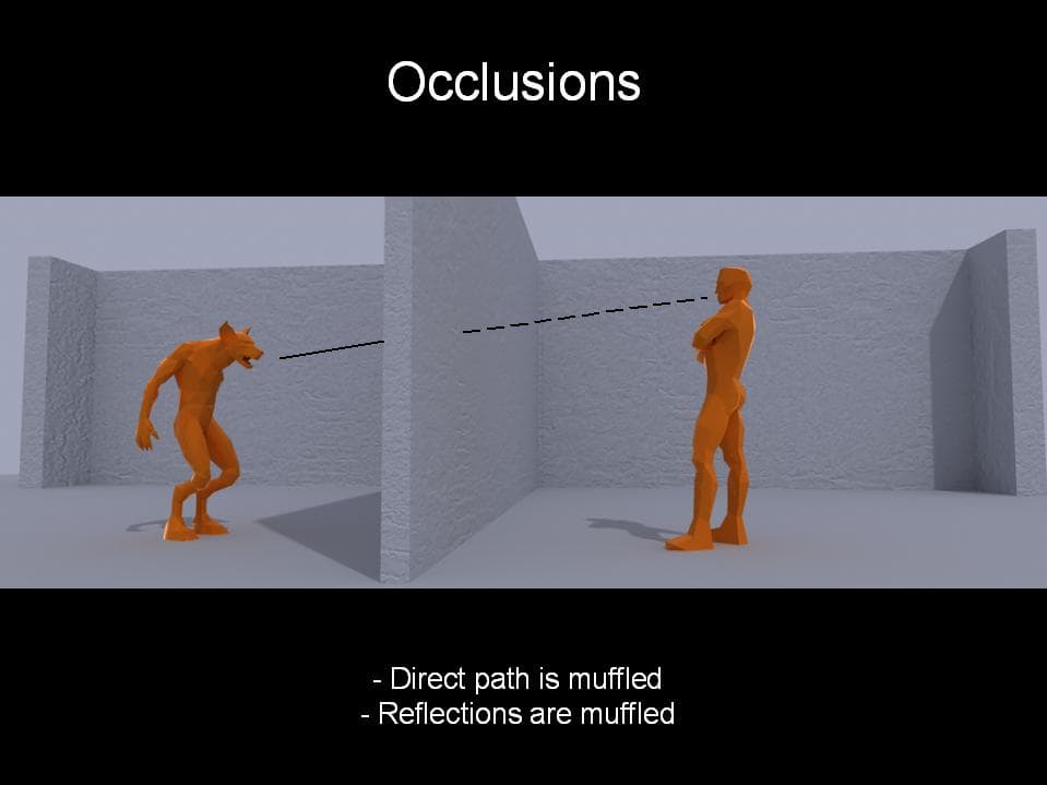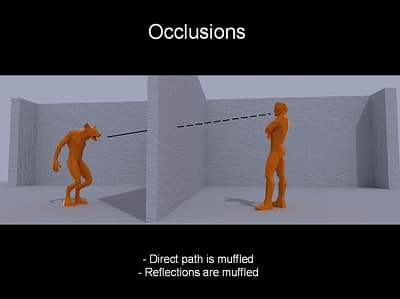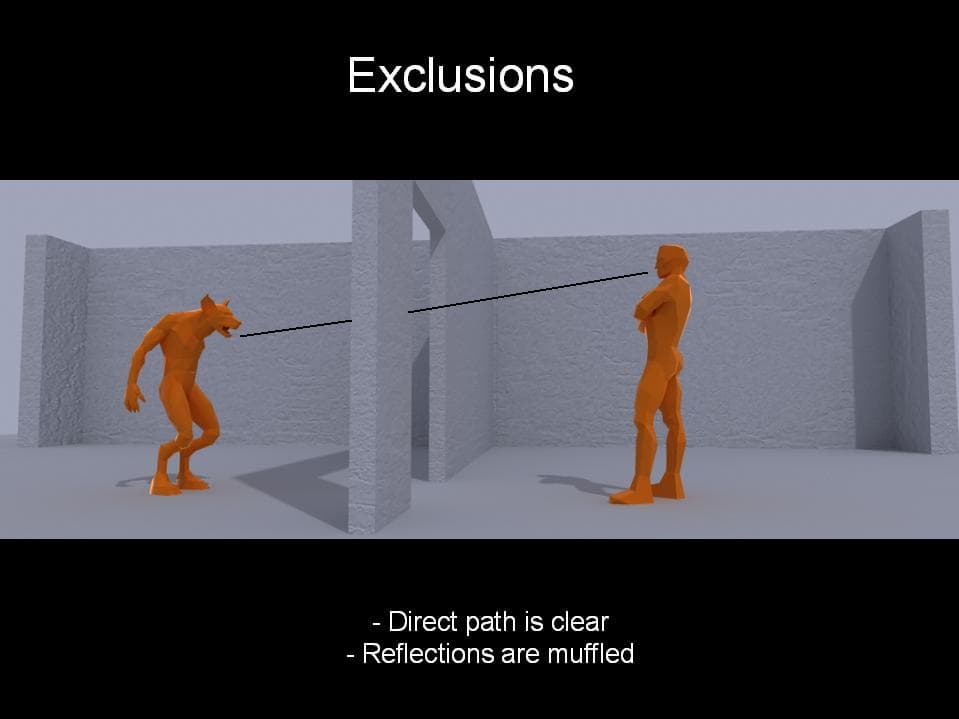 В большинстве случаев достаточно одного типа окклюзии — звук находиться за «глухой» преградой. При этом, direct path составляющая звука будет заглушена и степень фильтрации определяется геометрическими параметрами (толщиной) и материалом, из которого сделана стенка. Так как прямого контакта источника и слушателя нет (они находятся в разных комнатах), то по этому же принципу заглушается эхо от источника.