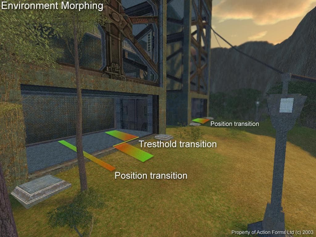 - Второй тип — Threshold transition: автоматическое изменение параметров начинается тогда, когда игрок пересек некую переходную границу между помещениями.