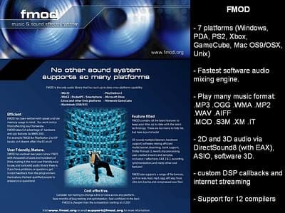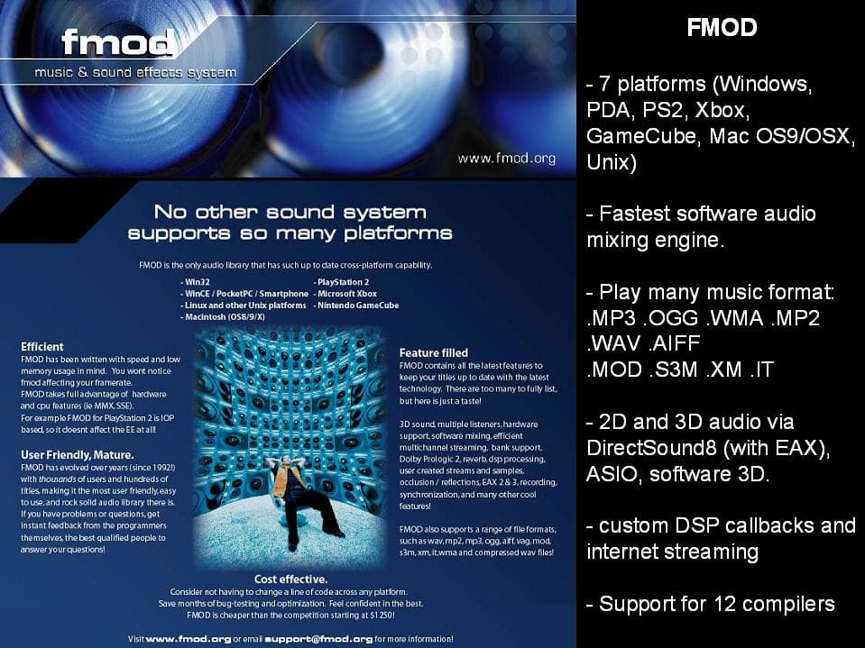 Итак 2003 год, единственный АПИ, поддерживающий 7 (семь!) платформ PC (win32), PlayStation2, XBOX, GameCube, Linux, Mac OS (OSX) и PDA (winCE). Также единственный АПИ, поддерживающий технологию Multiple Listeners, 12 компиляторов под любой язык программирования от Visual Basic, до ассемблера, самые быстрые софтварный код микшера, быстрый декодер MP3 (к сожалению нужна дополнительная лицензия Thompson multimedia чтобы использовать MP3 для коммерческих приложений), но есть альтернатива — OGG или WMA. Вот далеко не полный список всего что есть в FMOD. Рекомендую зайти на их сайт www.fmod.org, чтобы посмотреть все, что там есть, а также цены на лицензирование. По секрету, готовиться аппаратный драйвер FMOD на нескольких платформах windows и на мобильных телефонах (PDA) — так что скоро это будет полноценный АПИ. Возможно, FMOD постигнет участь Aureal — его купит какая-нибудь большая компания, но пока FMOD уверенно завоёвывает позиции на рынке.
