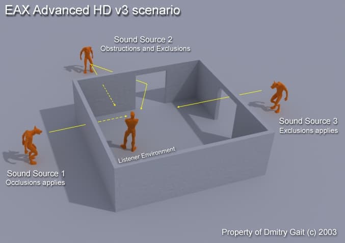 - звуки могут так же проходить сквозь объекты, такие, как вода или стены (occlusions или звук, прошедший сквозь препятствие).