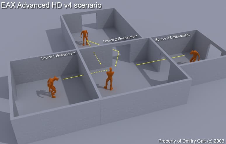 Конечно же, эти установки требуют большего числа вызовов функций ЕАХ4: надо установить все окружения: для источников, слушателя и эффекты для каждого источника, но зато мы получаем более реалистичное звучание — каждый из источников звучит так, как будто он находиться в разных комнатах со слушателем вместо просто звучания вне комнаты слушателя как в примере с ЕАХ3.