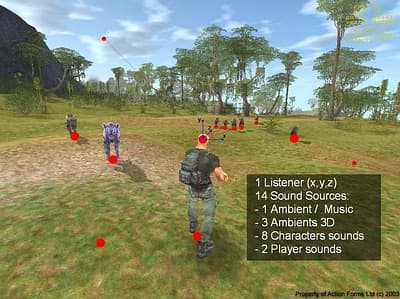 Вот типичный вид в 3D-шутере от третьего лица на примере игры Vivisector: Beast Inside (производитель Action Forms). Выделим основные элементы звуковой картины: Слушатель (Listener) и Источники звука (Sound Sources). Причем, некоторые из источников звука — обычные стерео, такие как фоновая музыка (в данной конкретной игре это main ambient: ветер или трек «звуки джунглей»), 8 источников создаются игровыми персонажами-монстрами, 1 источник создает непосредственно игрок — выстрел, звуки шагов и 3 случайных источника — для усиления эффекта пространства (ambient sounds) — в данном случае «джунгли»: звуки насекомых, птиц и т.п.