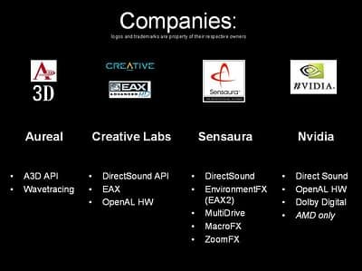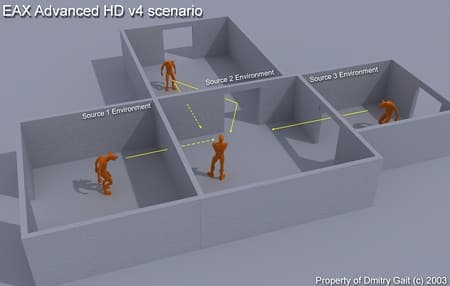 Потом, появились первые карточки с аппаратным 3D-звуком и встал вопрос о совмещения аппаратного и софтварного 3D-звука — и тут началась гонка за технологиями: поддержка Aureal A3D, Creative Labs EAX 1, EAX 2, софтварный менеджер геометрии сцены — для совместимости с А3D.