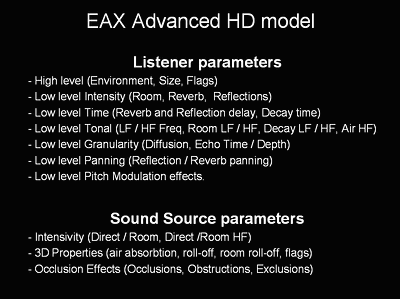 В 2001 году Creative анонсирует новую звуковую карту Audigy и новые функции ЕАХ, который теперь и далее называется EAX Advanced HD. Теперь это 25 (!) параметров для точной настройки слушателя и 18 параметров для настройки источников, включая еще 2 новых эффектов окклюзии.
