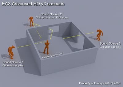 Примерно в 1997-1998 годах Creative выпускает ЕАХ версии 1. Это примитивный набор из 26 пресетов и всего 3х параметров для более точной настройки параметров Слушателя и всего 1 параметр для настройки источников. После некоторого затишья, выходит ЕАХ версия 2. Это существенный прорыв вперед и ЕАХ2 (14 параметров для настройки слушателя и 13 для источников, включая эффекты окклюзии) практически принимают как стандарт для игр. Interactive Audio Special Interest Group (www.iasig.org) создают стандарт IASIG Level 2, который практически базируется на ЕАХ2, но с некоторыми недочетами. Дело в том, что каждая компания, которая внедряет IASIG Level2 — Microsoft Direct Sound 8, Sensaura EnvironmentFX, Aureal A3D вносит свой дополнения: другой порядок расположения параметров, разные названия параметров. Это все вносит некоторые неудобства в настройку и портирования. Я не буду долго останавливаться на ЕАХ2 — это все можно прочитать в SDK на сайте developer.creative.com.