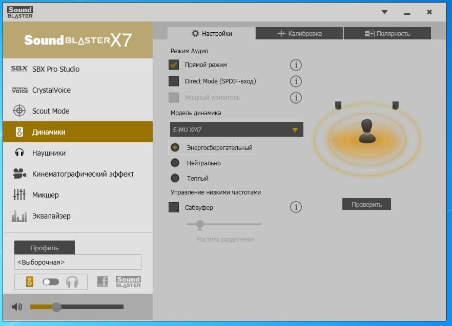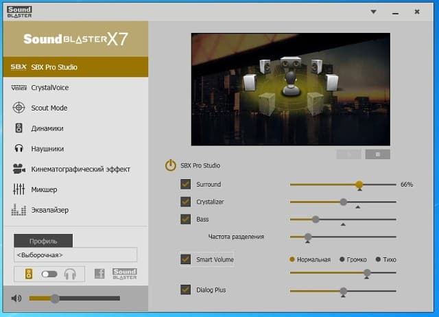 У пользователя, который никогда не слышал вживую Hi-Fi-колонок, может случиться шок от высокой детальности звука, стерепанорамы, полноценного частотного диапазона, без компромиссов. Старые записи захочется переслушать заново. Потом, возможно, возникнет желание как-то еще улучшить звук. Звуковая карта X7 в этом плане способна предложить довольно много регулировок, начиная с эквалайзера и заканчивая аппаратными обработками SBX Pro Studio.