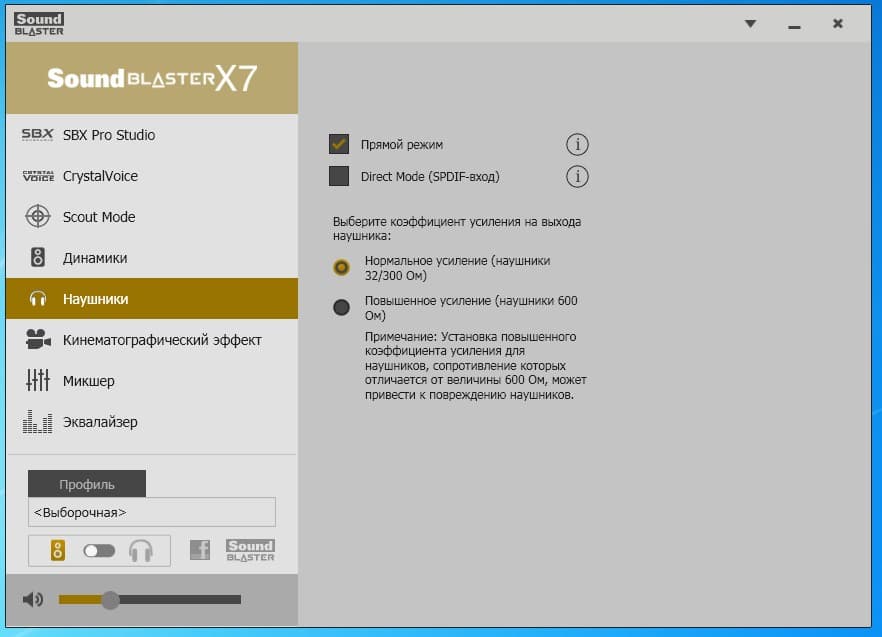 Для наушников есть две стандарные опции: ограничения громкости и отдельный выбор прямого режима, чтобы он не влиял на установку для колонок.