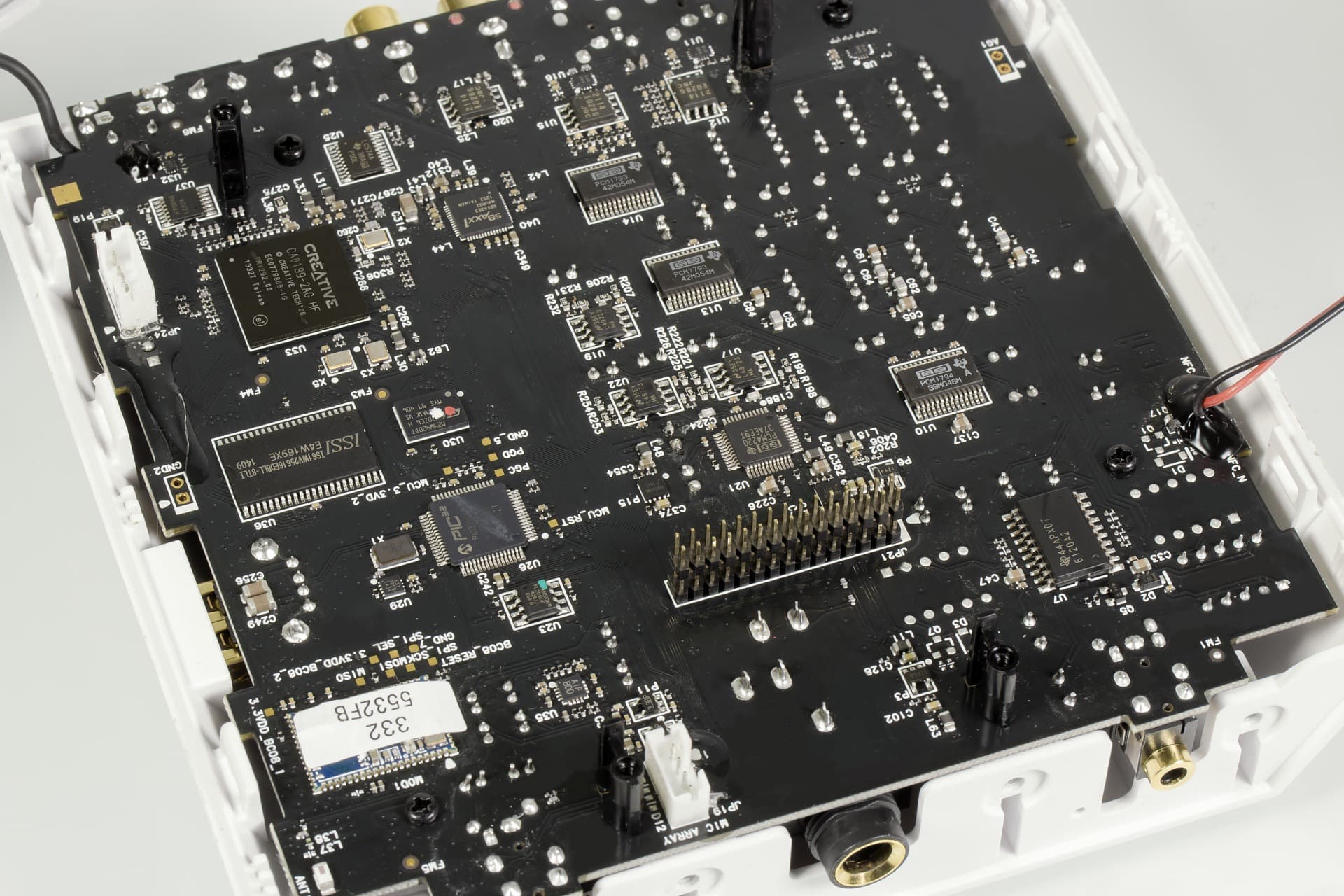 Внутри имеются несколько отдельных печатных плат. На основной расположены цифровые и аналоговые элементы, а также отдельная платка Bluetooth-модуля. Усилитель мощности с радиатором вынесен на отдельную плату. Предусмотрено только пассивное охлаждение. При работе корпус слегка теплый, так как класс D эффективно переводит в звук более 90% энергии, и лишь остальное рассеивается в виде тепла.