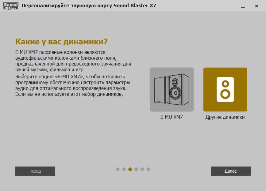 Разница между E-MU XM7 и другими динамиками в том, что в последнем случае появляется опция 5.1 каналов на линейных выходах. Позже в панели можно переназначить любые опции, заданные в мастере установки.