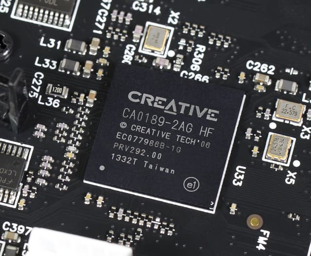Собственный USB-контроллер Creative CA0189-2AG, также стоящий в большинстве внешних карт Sound Blaster, не обеспечивает никакой особенной обработки, зато работает на шине USB 2.0 и обеспечивает готовые I2S-порты связи с конверторами и отдельный выход связи для эффект-процессора. Стоит отметить, что Creative пришлось разориться на несколько тактовых генераторов TCXO, класса «подороже-получше-чем-в-ZxR», в том числе на выделенный кварц для частот, кратных 44,1 кГц, и для частот, кратных 48 кГц. Генераторы с высоким фазовым шумом банально не позволят получить высокий сигнал/шум, поэтому были найдены красивые позолоченные TCXO. Отставание от Asus в области «компонентного феншуя» ликвидировано.