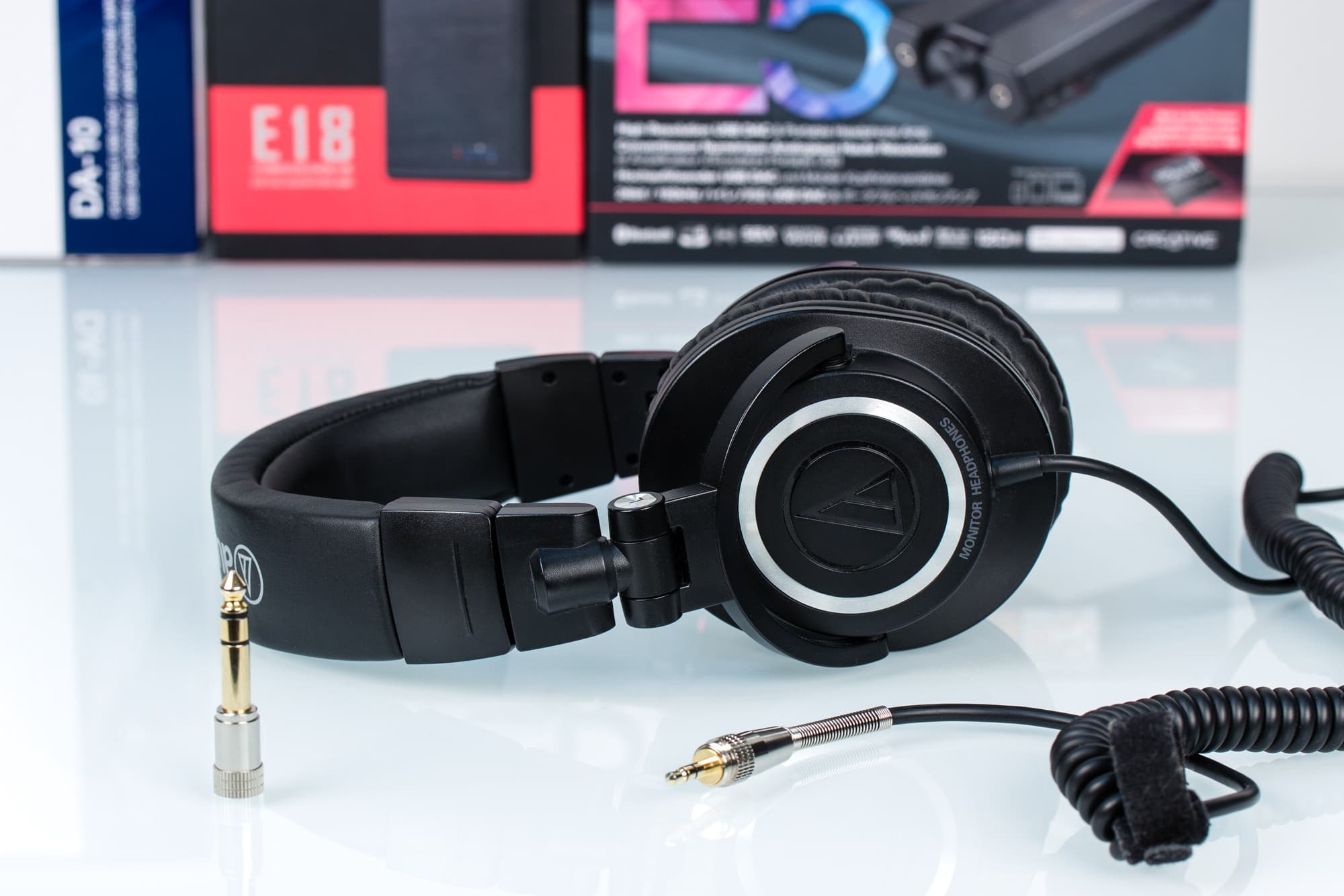 Audio-Technica ATH-M50x (9 тыс. рублей) — очень популярная модель с хорошо сбалансированным звуком и детальностью во всем диапазоне. Одни из лучших складных наушников, а акцент в области НЧ пригодится в дороге. Импеданс 38 Ом делает их пригодными для подключения прямо к смартфону, однако польза от отдельного усилителя есть, и немалая.