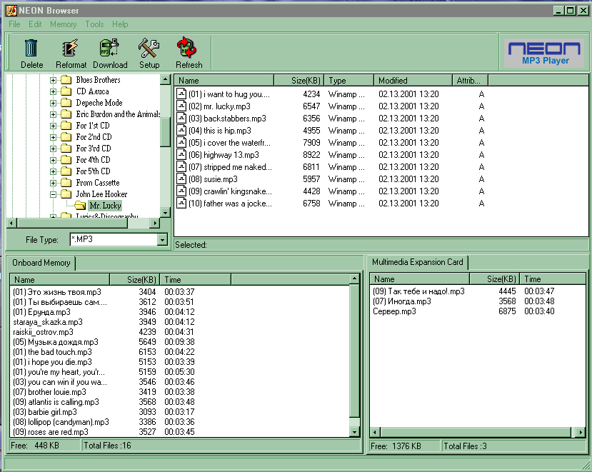 Для этого имеется в наличии слот для карт SmartMedia. Карту со стандартным форматом NEON не воспринял, предложив ее переформатировать. Я имел неосторожность согласиться. Получил низкоуровневое форматирование с затиранием служебных областей, после чего карту уже не воспринимали ни стандартный "картовод", ни фотоаппарат от Olympus. Что ж, бывает, конечно. И у Diamond Rio такие же проблемы были, но вот после него что-то я с подобным не сталкивался. Единственное: один из плееров amac тоже использует свой нестандартный формат, однако он способен вернуть карту в обычный режим работы и при помощи собственного ПО. Тут же никакой утилиты в комплекте не прилагалось. Вообще-то ситуация исправимая, но очень неприятная.