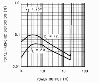 В данном случае микросхема LM1875 предназначена для низкочастотного сигнала на сабвуфер. И две микросхемы LM1876 для усиления сигнала на сателлиты. Давайте посмотрим на графики зависимости THD от мощности, взятые из спецификаций: