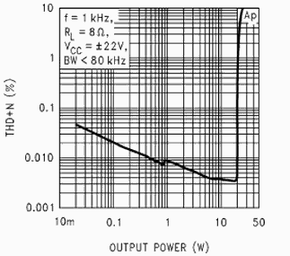 График зависимости THD от мощности микросхемы LM1876