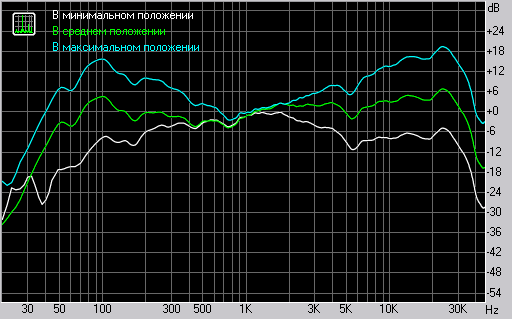 Здесь можно видеть наглядно работу регуляторов тембра. Судя по нашим измерениям, амплитуда сигнала изменяется в пределах 24 дБ на частотах 50 Гц и 20 кГц.