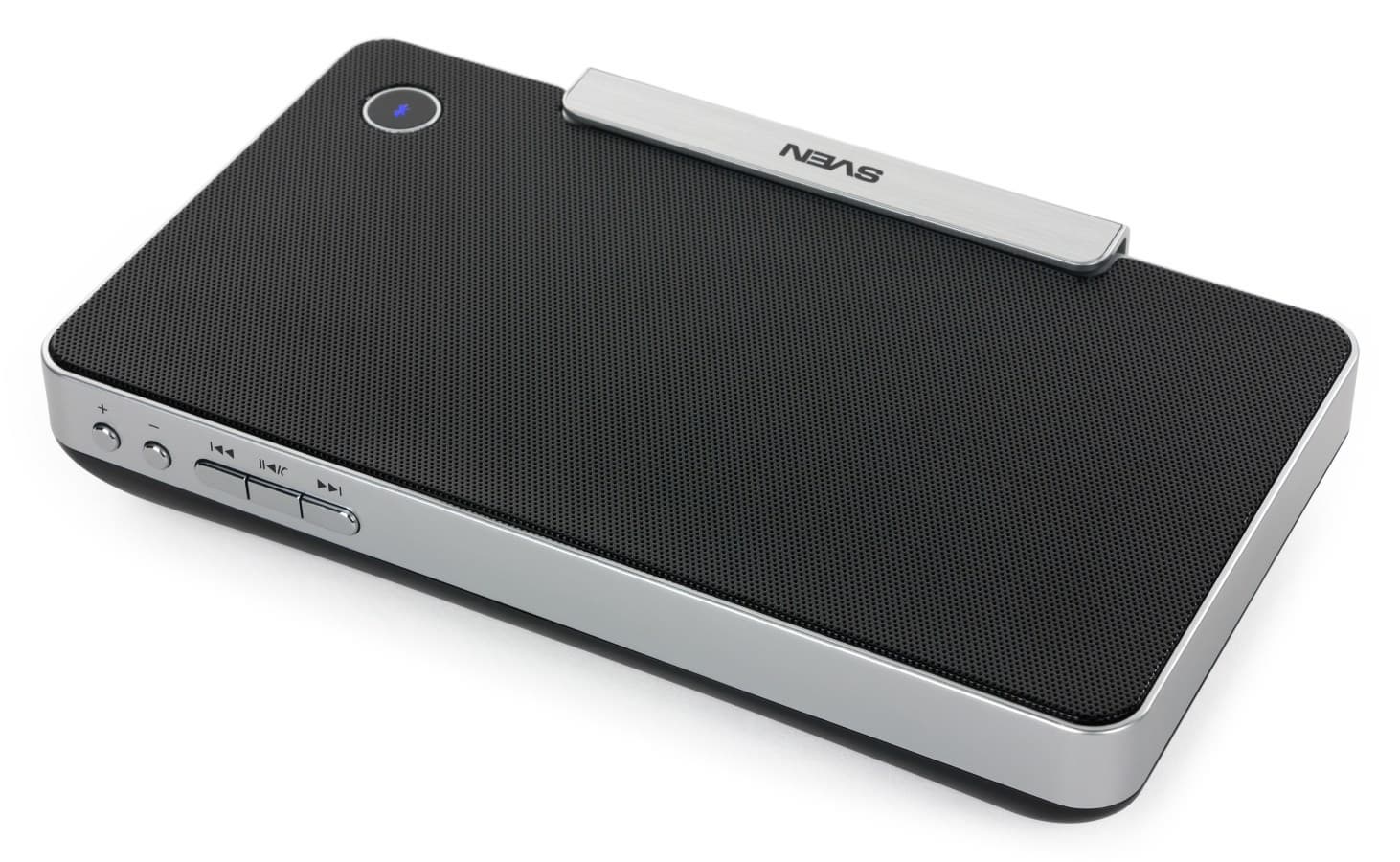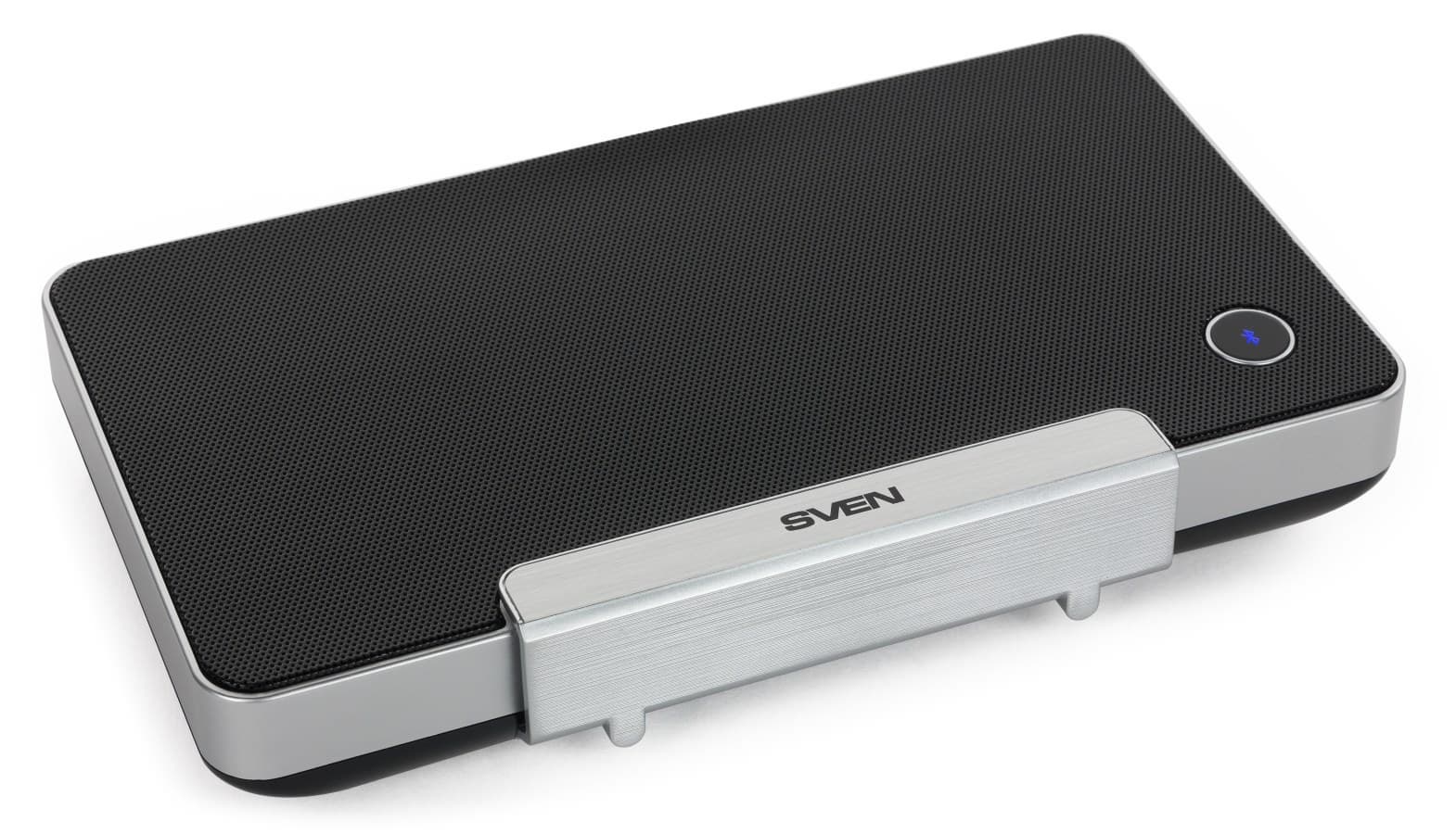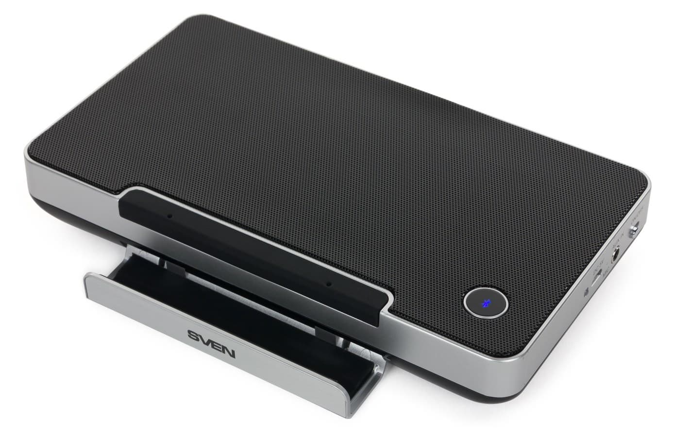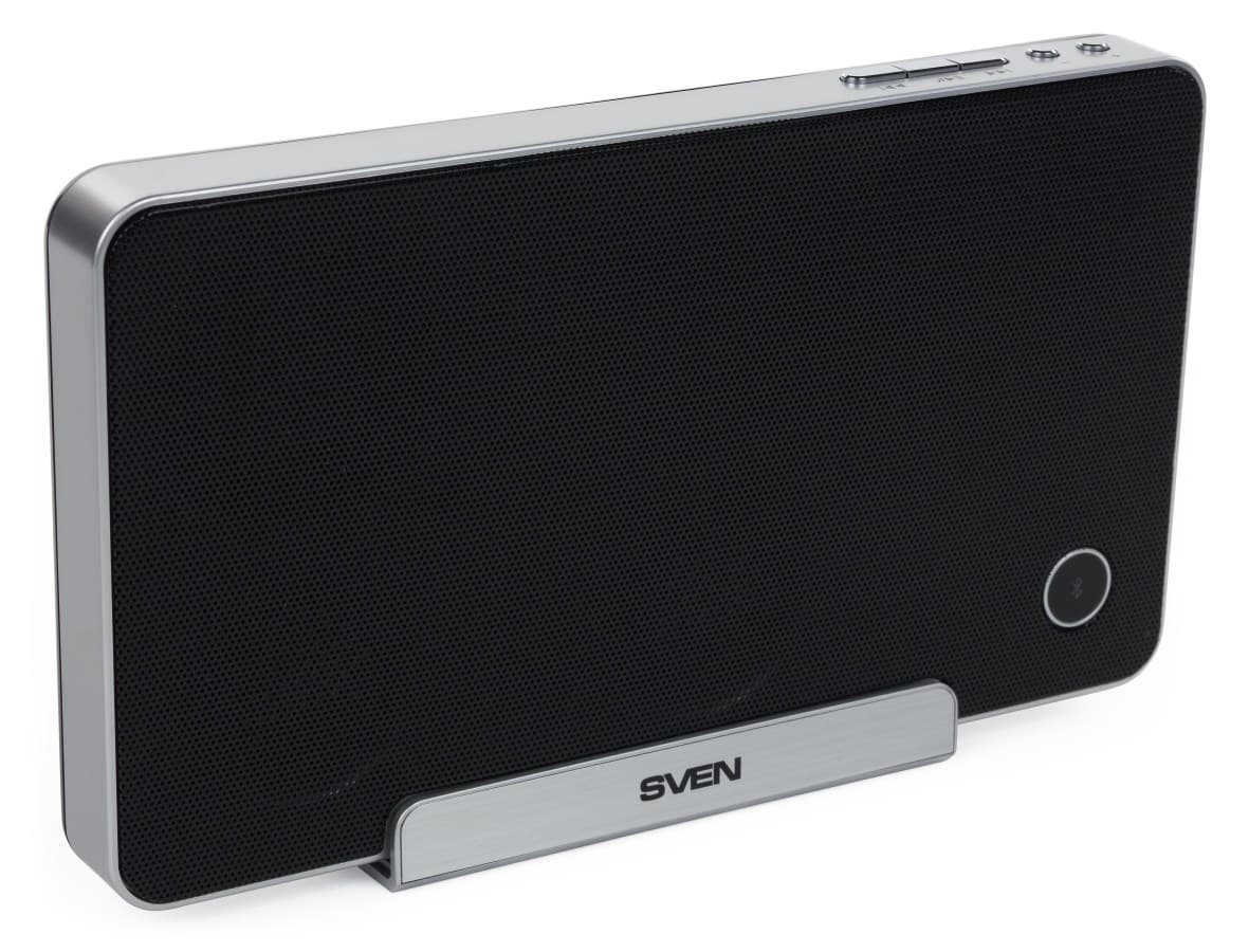 Пластиковая панель с логотипом Sven легко превращается в подставку для мобильного устройства. Поскольку изнутри она проложена резиной, глянцевый планшет или смартфон царапаться не будет.