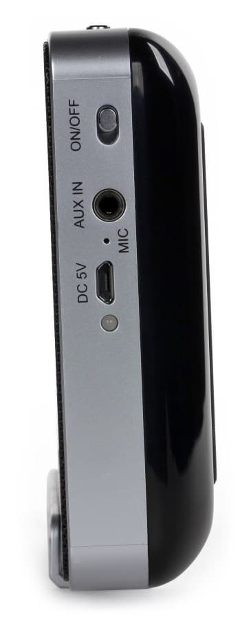 Боковая грань колонки изготовлена из серебристого пластика. Сзади находятся достаточно тугие кнопки для управления воспроизведением и громкостью. При нажатии они отзываются механическим щелчком. Из-за небольшой массы устройства (перед нами все-таки портативная колонка) его нужно фиксировать от сдвига с противоположной стороны.