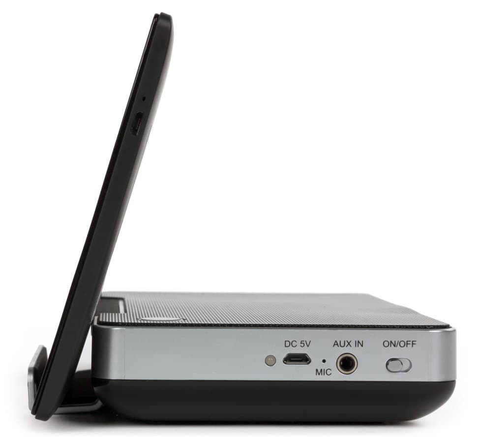 Форм-фактор акустической системы привлекает своей универсальностью: в подставку не встроено никаких разъемов, что позволяет устанавливать устройства как с Lightning, так и с Micro-USB. Да и на стоимости устройства такая простота отражается положительно. В целях экономии энергии легко воспользоваться комплектным кабелем и не включать Bluetooth вообще — длины провода с запасом хватит на любой планшет.