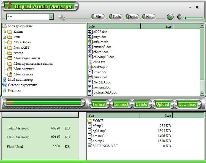 Отличия от программ данного класса минимальны: все точно то же самое, к чему я успел привыкнуть за последние два года. Ни ярких достоинств, ни недостатков, все возможности вполне стандартны: запись любых файлов в память или на карту расширения, форматирование памяти или карты расширения, сортировка файлов, запись немузыкальных файлов обратно на компьютер. Да, защита от копирования музыки на компьютер в наличии: