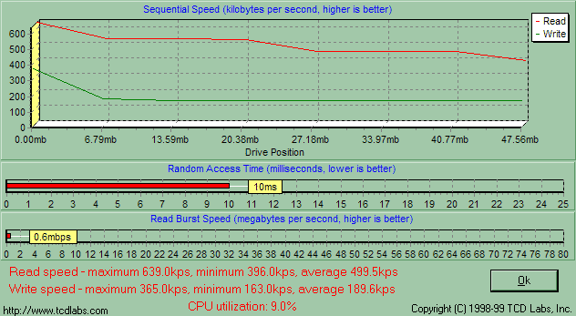 Эмуляция дискового накопителя позволяет полноценно протестировать скорость обмена данными с компьютером, что я и сделал. Перед вами результаты (слева — встроенная память, справа — карта расширения). Блестящими их никак не назовешь: скорость записи ниже 2 Мбит/с, в то время как минимальным значением де-факто уже давно стало 2.5 Мбит/с (даже весьма тормозные NetMD-плееры на такое способны, не говоря уже о флэшовых моделях). Скорость чтения же неплоха. Использование памяти на карте расширения еще более ухудшает ситуацию — тут уж нужно говорить всего об одном мегабите в секунду при записи. Впрочем, сам плеер не виноват: спасибо стандарту MultiMediaCard, просто неспособному на высокие скорости.