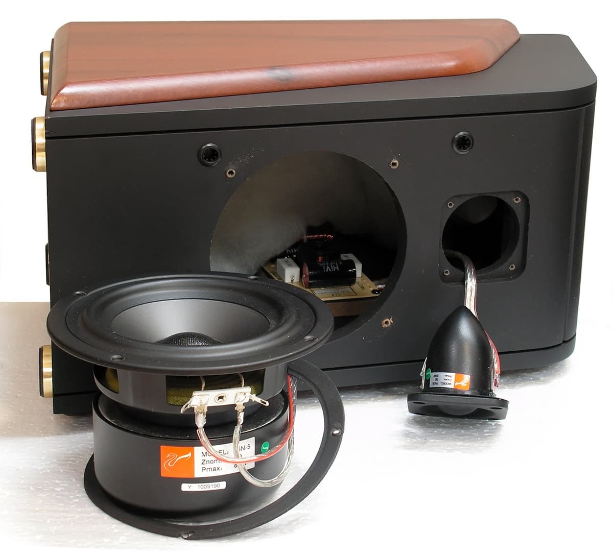 Используемые в колонках динамические головки имеют магнитное экранирование. Диаметр диффузора низкочастотного динамика S5, включая подвес, составляет 10,5 сантиметров. Гибкий подвес выполнен из резины и тактильно очень мягкий. В качестве пищалки используется купольный твиттер из ткани, маркировка динамика NT25. Диаметр купола составляет 30 миллиметров.
