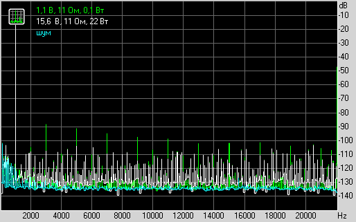 Спектр искажений усилителя для 1 кГц на нагрузке 11 Ом