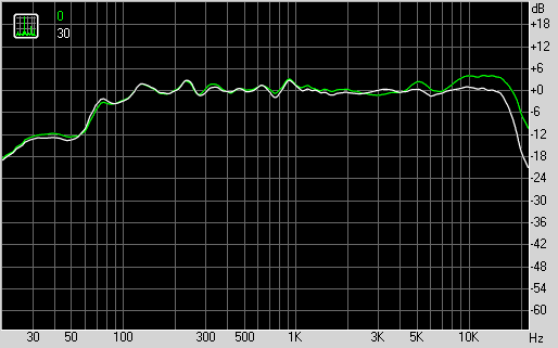 При таких положениях тембров неравномерность на высоте высокочастотника составляет ±3 дБ, с небольшим подъемом на высоких частотах. Неравномерность в области низких частот будет зависеть только от помещения. При измерении под 30° можно видеть очень низкую неравномерность, выше 1 кГц АЧХ выравнивается до ±1 дБ — это отличный результат для любого класса АС.