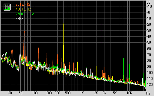 Спектры сигналов, воспроизводимые колонкой K3 C2149, при подаче частот 60, 400 и 2500 Гц.