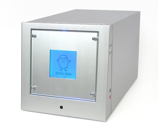 Передняя панель — матричный ЖК-экран с приличным разрешением, на который в stand by режиме выводятся идушие стрелочные часы с будильником. В процессе же работы компьютера на дисплее появляются различные анимированные изображения. В релизной версии Hi-Fi PC на дисплей обещают выводить полезные данные, вроде информации о проигрываемых музыкальных композициях, а в Windows — мониторинг температуры процессора. Подсветка дисплея может динамически изменяться на красний, синий и зелёный цвета.
