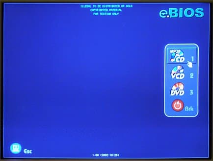 В той версии, что была у нас на тестировании, имелся выбор из 4-х пунктов: MP3/CD-плеер, VCD-плеер, DVD-плеер, выход из программы. Последний пункт означает переход к загрузке операционной системы, расположенной на винчестере (или на любом другом выбранном в БИОСе устройстве).