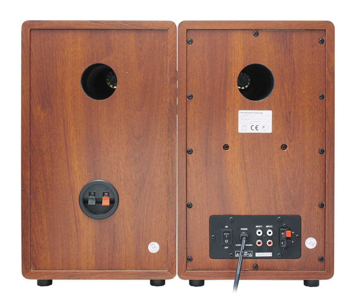Подключение пассивной колонки к усилителю осуществляется посредством пружинных зажимов под оголенный провод. Длина провода для подключения составляет два метра. На задней стороне активной колонки расположен выключатель питания, два линейных входа и пружинные зажимы для подключения пассивной колонки.