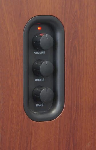 Панель управления расположена на боковой панели активной колонки. Включает в себя регуляторы общей громкости, отдельно низких и высоких частот и индикатор питания.