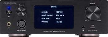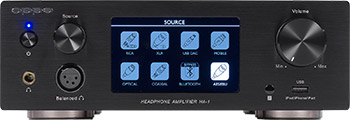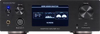 Рассмотрим фасад устройства. Сразу бросается в глаза большой ЖК-дисплей, крупные ручки выбора входов/настройки и громкости. Также на фасаде есть вход USB, кнопка питания и выходы наушников (6,3 мм и балансный XLR 4-pin). Регулятор громкости — аналоговый с моторизованной ручкой. Аппарат имеет два режима работы: для наушников с сопротивлением менее 100 Ом предназначен нормальный режим, для наушников с бо́льшим сопротивлением предназначен режим высокой мощности.