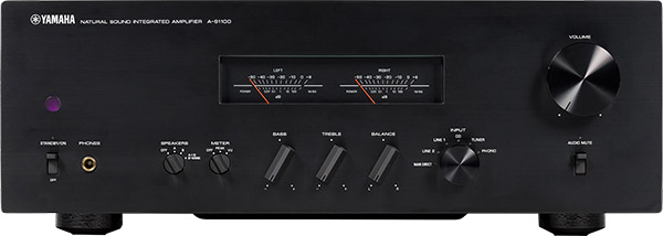 Фасад усилителя — цельная алюминиевая пластина толщиной 5 мм со специально нанесенными потертостями. На ней гармонично смотрятся традиционные для техники Yamaha тумблеры, поворотные рукоятки и круглые регуляторы. Регулятор громкости крупный, переключатель входов имеет фиксированные положения с четким тактильным ощущением остановки. Нас порадовало наличие нечасто встречающейся ныне в усилителях регулировки тембров — НЧ и ВЧ. Регулятора для СЧ не предусмотрено. Отдельной кнопки для режима Direct нет, но при установке обоих регуляторов тембра в среднее положение слышен отчетливый щелчок, и усилитель переходит в режим Direct (обход схемы тембров). Также на фасаде имеется стереовыход 6,3 мм для наушников, который тоже не всегда встречается в современных усилителях.