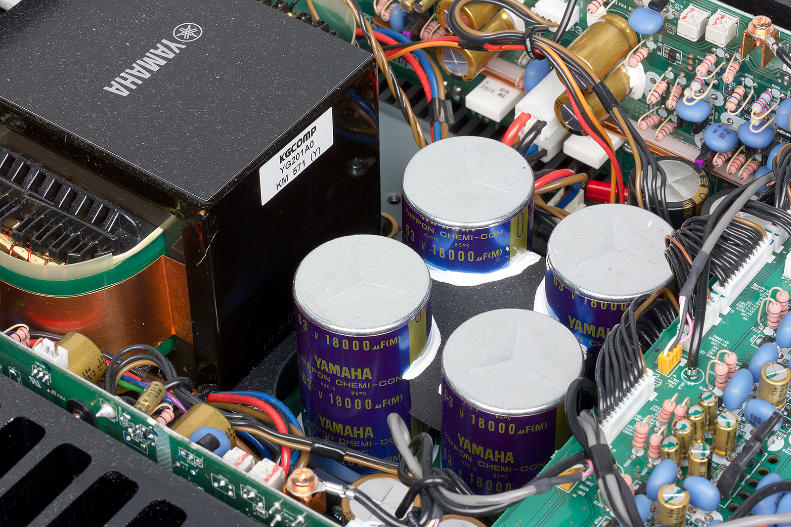 Заглянем внутрь. Трансформатор имеет немалый размер и смонтирован в отдельном экранированном блоке. Установлены четыре «бочки» конденсаторов емкостью по 18 000 мкф. Конструкция симметричная, источник питания расположен посередине, усилители мощности — симметрично слева и справа. Выходные звенья УМ — на полевых МОП-транзисторах. Производителем декларируется «разработанная специалистами Yamaha уникальная технология симметричного усиления мощности с “плавающими” источниками питания». Корпус массивный, жесткий и устойчивый.