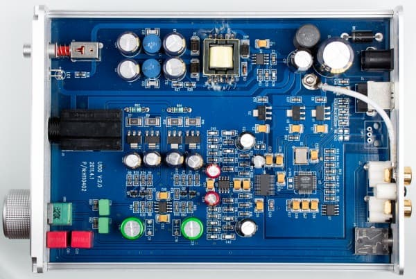 USB-контроллер, и он же по совместительству цифровой процессор Tenor TE7220L (USB 2.0 24 бит 96 кГц), работает от единственного кварцевого генератора и формирует как клок для любой частоты, так и управляющий конверторами. С процессора сигнал поступает на ЦАП Cirrus logic CS4398 (120 дБ, КГ+шум −107 дБ). Данная микросхема ЦАП прекрасно знакома нашим читателям, она имеет хорошую репутацию и широко применяется во многих звуковых устройствах. Интересен выбор ОУ в аналоговой части: ADA4075-2. Монтаж и разводка — на современном уровне, никаких самоделок pull-through. Применяются качественные SMD-элементы, включая металлопленочные конденсаторы CBB Panasonic и резисторы с гарантированным отклонением от номинала не более 0,5%.