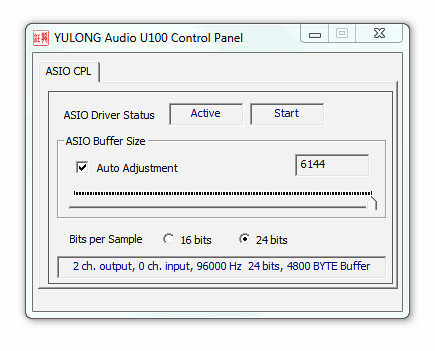 Что выделяет YuLong U100 среди самоделок — так это драйвера с поддержкой ASIO, выбором битности и индикацией текущего режима. ASIO-панель весьма необычная. Она показывает реальный режим работы карты — частоту и разрядность данных, а также позволяет поставить огромный размер буфера. Это необходимо для отсутствия щелчков в режиме побитной передачи через ASIO даже на слабых системах.