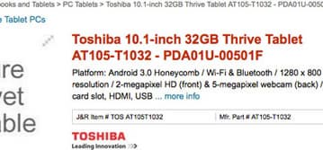 Планшет Toshiba Thrive ненадолго появился на онлайновой витрине J&R