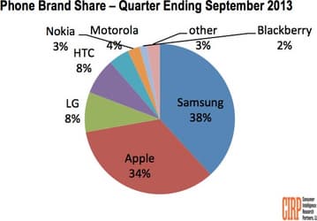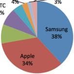 Доля Samsung равна 38%, Apple — 34%