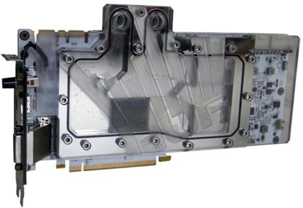 Водоблок изготовлен из меди и никелирован. Он отводит тепло от всех основных источников тепла на плате. Крышка — пластиковая. Для подключения к СВО используются стандартные четвертьдюймовые фитинги.
