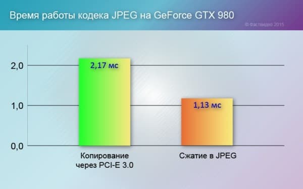 Пересылка одного 24-битного изображения с разрешением 4K (3840 x 2160) через шину PCI-E 3.0 x16 занимает 2,17 мс. Сжатие этого же изображения примерно в 10 раз по алгоритму JPEG, что соответствует коэффициенту качества JPEG 90% при прореживании 4:2:0, теперь можно сделать за 1,13 мс на видеокарте Nvidia GeForce GTX 980 (CUDA-6.5, 32-bit).