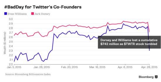 Сооснователи Twitter Inc Эван Вильямс (Evan Williams) и Джек Дорси (Jack Dorsey) потеряли за день суммарно около 750 млн долларов в результате падения акций компании.