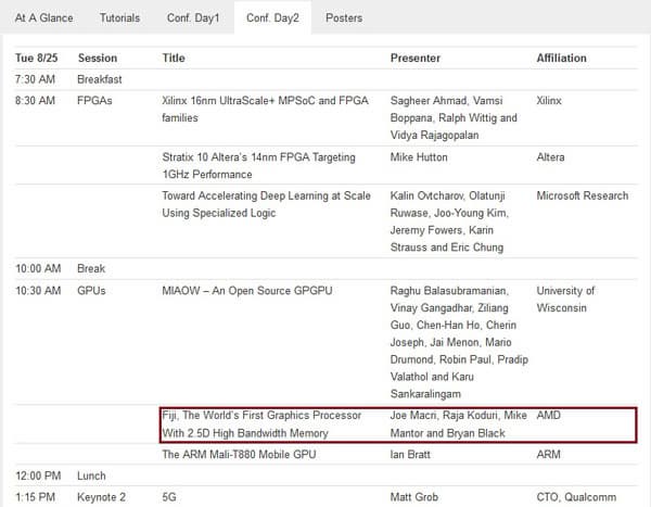 На этой недвусмысленно указывает название доклада, включенного в график мероприятия HotChips, которое пройдет с 23 по 25 августа этого года: «Fiji, The World’s First Graphics Processor With 2.5D High Bandwidth Memory» («Fiji, первый в мире графический процессор с памятью High Bandwidth Memory 2.5D»). Докладчиками выступят разработчики GPU, ранее работавшие в ATI и сейчас работающие в AMD.