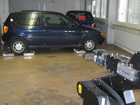 Комплект из четырех маленьких робо-тележек переместят автомобиль в нужное место