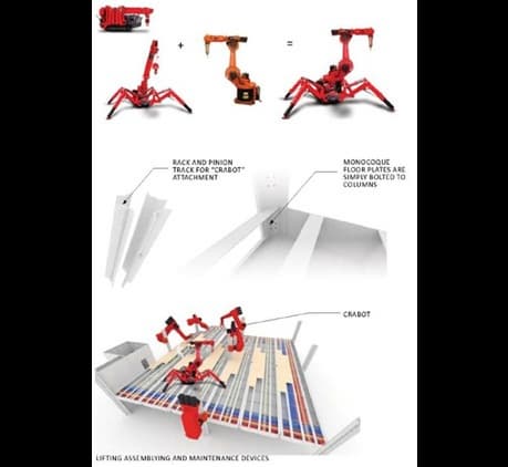 Габариты роботов, судя по всему, будут достаточно невелики, так что их задача будет состоять не в установке несущих элементов конструкции. Crabots пригодятся на следующем этапе работ для установки различных элементов внутри здания. Роботы смогут перемещаться внутри кампуса, устанавливать различные блоки и панели, то есть, делать то, что обычно делают люди при помощи различных подъёмников, блоков, лебёдок и прочих инструментов и приспособлений. К слову, максимальная грузоподъёмность робота составит 10 тонн.