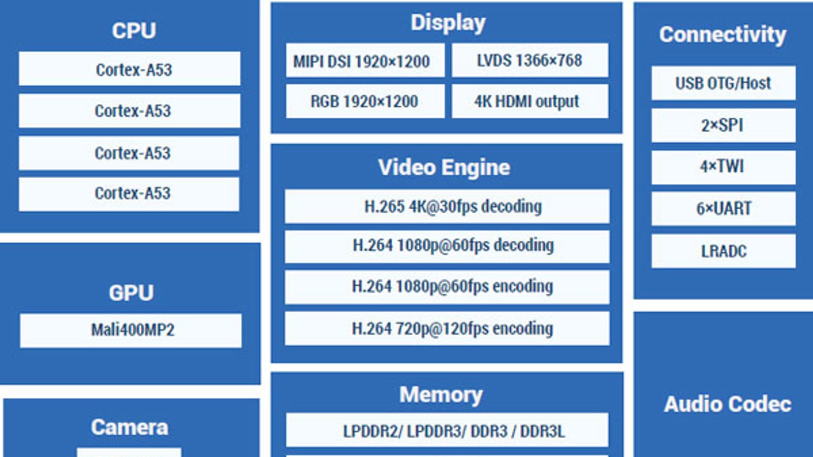 В конфигурацию A64 входит четыре ядра ARM Cortex-A53. По словам AllWinner, по производительности они превосходят ядра ARM Cortex-A7 более чем на 30%. Роль GPU досталась Mali-400MP2. Встроенный контроллер памяти A64 поддерживает память LPDDR2, LPDDR3, DDR3, DDR3L и eMMC5. Процессор оснащен видеокодеком H.264, поддерживающим разрешение 1080p с частотой 60 к/с, и декодером H.265, поддерживающим разрешение 4К с частотой 30 к/с. Список интерфейсов для подключения дисплеев включает MIPI DSI (максимальное разрешение — 1920 х 1200 пикселей), LVDS (1366 х 768), RGB (1920 х 1200) и HDMI (4K). Есть также периферийные интерфейсы USB (OTG и хост), SPI (x2), TWI (x4), UART (x6) и LRADC. Завершает картину звуковой кодек и возможность подключения камеры разрешением до 5 Мп.