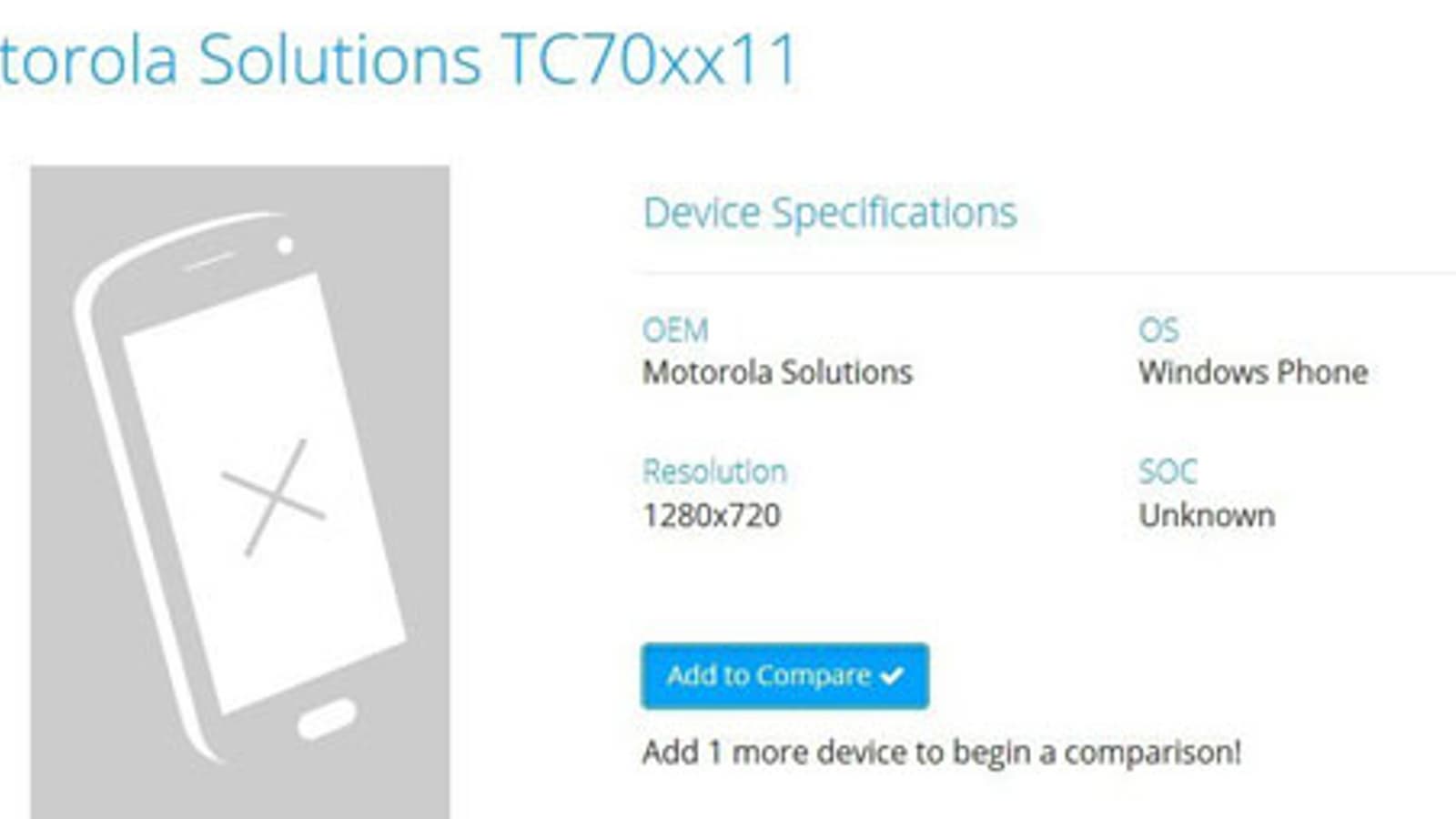 Устройство под названием Motorola Solutions TC70xx11 построено на неназванной однокристальной системе с двухъядерным процессором. Оснащение TC70xx11 включает дисплей разрешением 1280 х 720 пикселей.