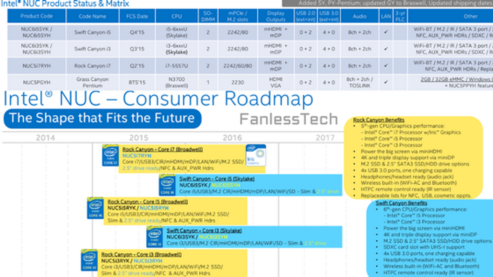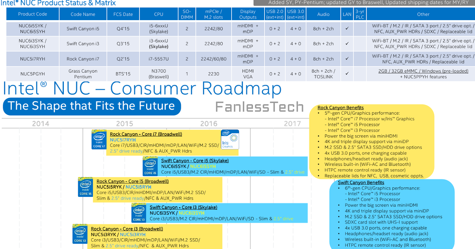 Процессоры Intel Skylake только готовятся к появлению на рынке, а ресурс FanlessTech уже раздобыл дорожную карту процессорного гиганта, в которой фигурируют мини-ПК NUC на основе этих CPU.