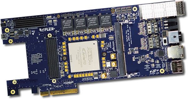 Основой набора служит мезонинная карта с FPGA Altera Arria 10. Кстати, средствами именно этой FPGA был реализован контроллер DDR4-2666, показанный Altera в декабре прошлого года. На плате также находится 4 ГБ памяти DDR4, 128 МБ флэш-памяти NOR и 32 Кбит памяти EEPROM с последовательным интерфейсом I2C. Оснащение включает интерфейсы Gigabit Ethernet, USB и PCIe x8. Для подключения монитора есть выход DisplayPort 1.2. Карта также оснащена разъемами для расширения. Ее размеры примерно равны 240 х 111 мм.